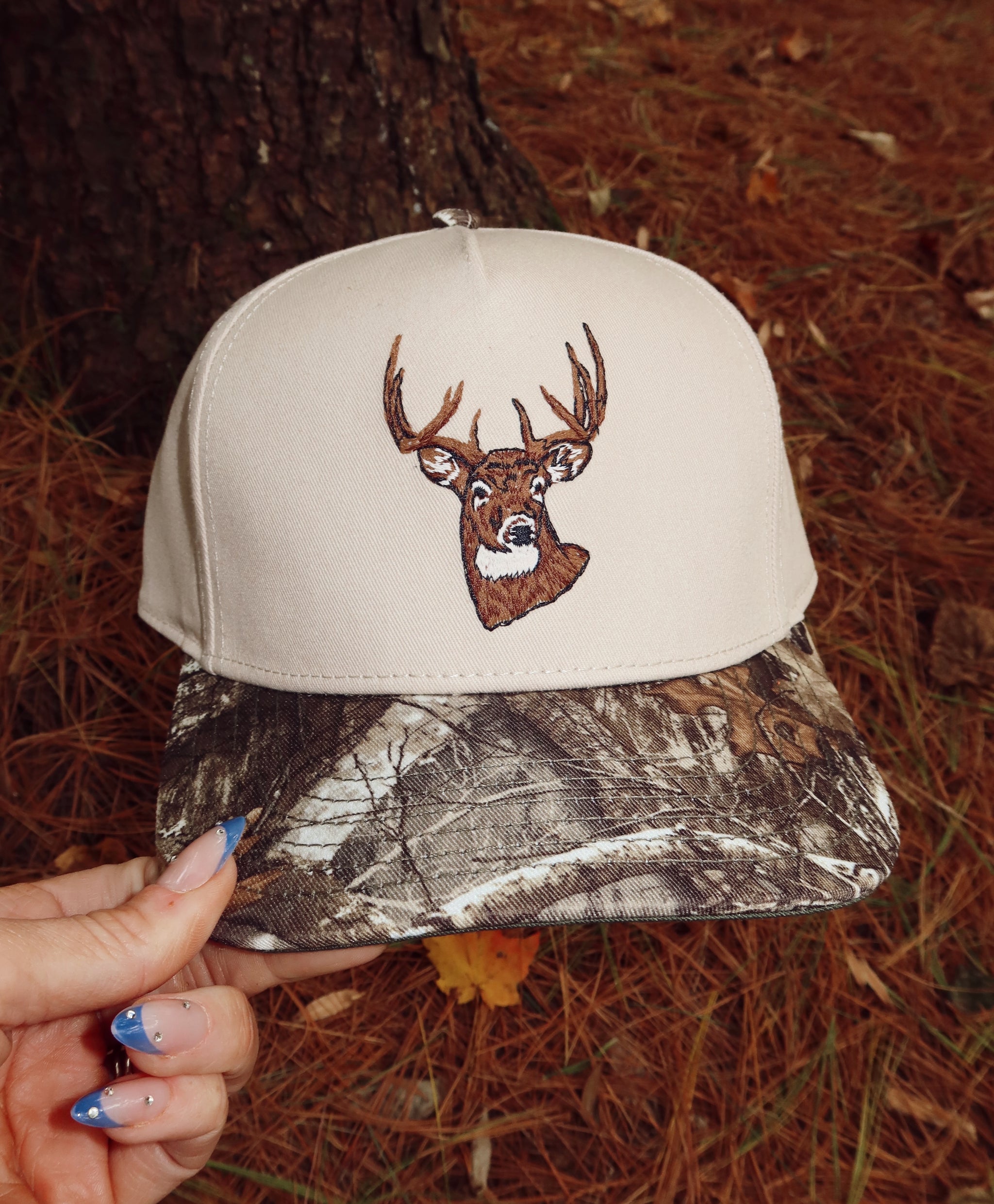 Fully embroiled buck camo trucker hat