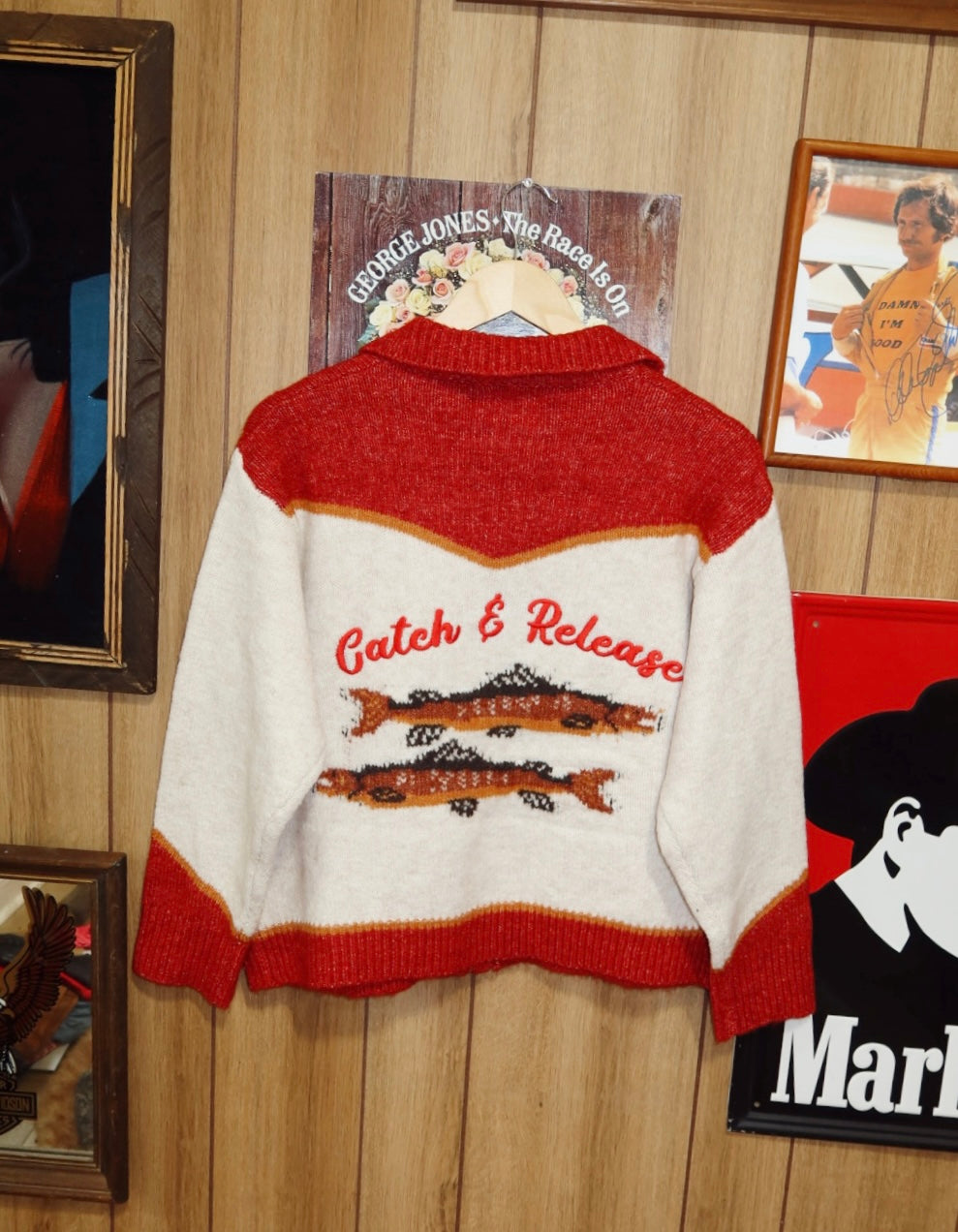 The cutest lil retro style fish sweater zip up for Spring y'all!
